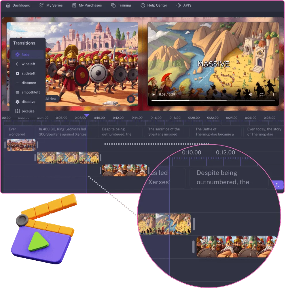 Turn simple ideas into complete videos in minutes. The AI crafts engaging storylines, adds human-like voiceovers, selects visuals, and syncs everything perfectly to keep viewers hooked.